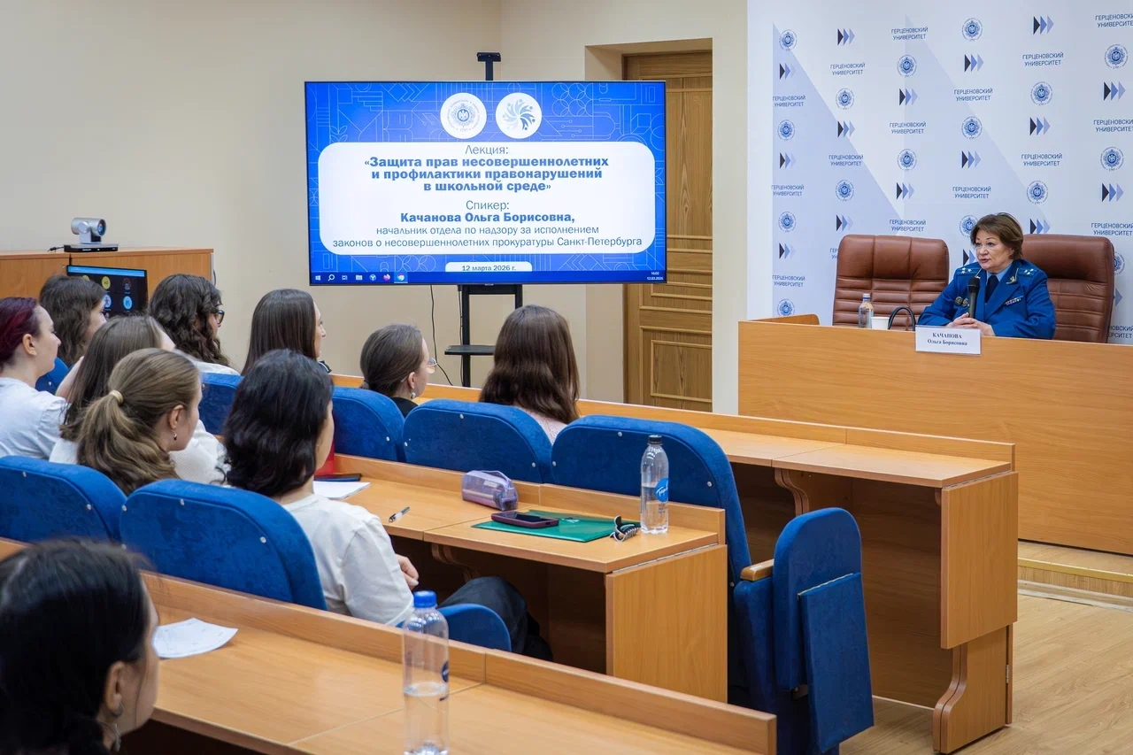 В Герценовском университете в рамках программы «Навыки учителя современной школы» (проект «Команда школьных педагогов под ключ») прошла встреча с Ольгой Борисовной Качановой — начальником отдела по надзору за соблюдением прав несовершеннолетних прокуратуры Санкт-Петербурга. Спикер — выпускница нашего университета.